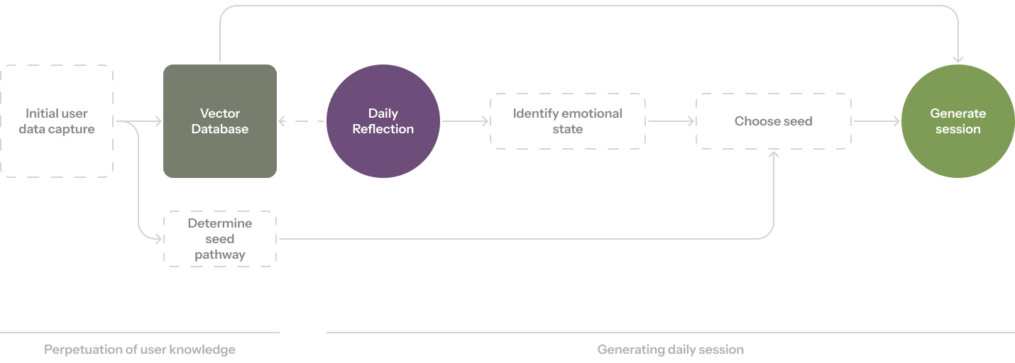 - Daily Retrieval Process: When identifying the user's emotional state for each day's session, the system performs similarity searches against the vector database, retrieving the most relevant previous experiences, patterns, and insights. This retrieved context is then used to inform seed selection and session generation.